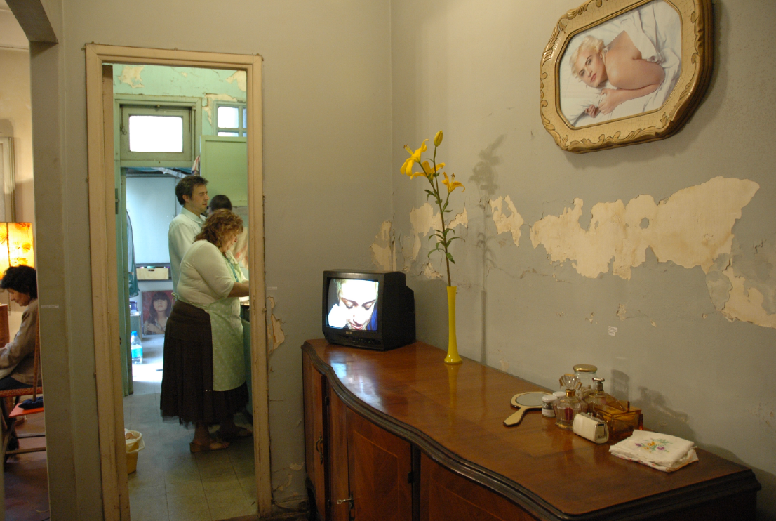 DESDE EL ALMA. Exhibición colectiva (junto a Zoe Di Rienzo, Carolina Katz y Julia Elena Dávalos), departamento deshabitado en Buenos Aires, Argentina, 2007. Vista general del living mientras canto Julia Elena Davalos.