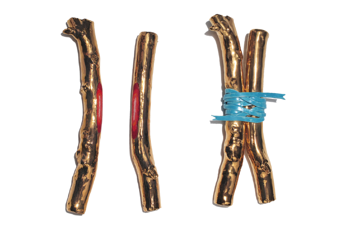 Con esta explicación cualquier enciclopedia botánica podría orientarnos sobre cómo producir dicho injerto. Al lado de estas instrucciones encontraríamos la imagen de las dos ramas, primero separadas y rasgadas, luego unidas y “vendadas”. Gabriel Baggio (en adelante GB) encontró esta imagen en los libros de jardinería de su abuelo durante su infancia. Hace cinco años, la pintó con témpera sobre papel, nuevamente unas ramas junto a las otras, en la didáctica secuencia que proponen los manuales. Hoy GB insiste con la imagen, realizada esta vez, en cerámica y esmaltada en oro. La versión áurica evidencia la importancia de esta imagen que condensa poderosamente su trabajo. Junto a la imagen, el origen de esta secuencia de textos y objetos: el libro del abuelo. El poder evocativo de la imagen se debe a la vinculación con dos aspectos fundamentales en el trabajo de GB, los tópicos del contacto y la cita.