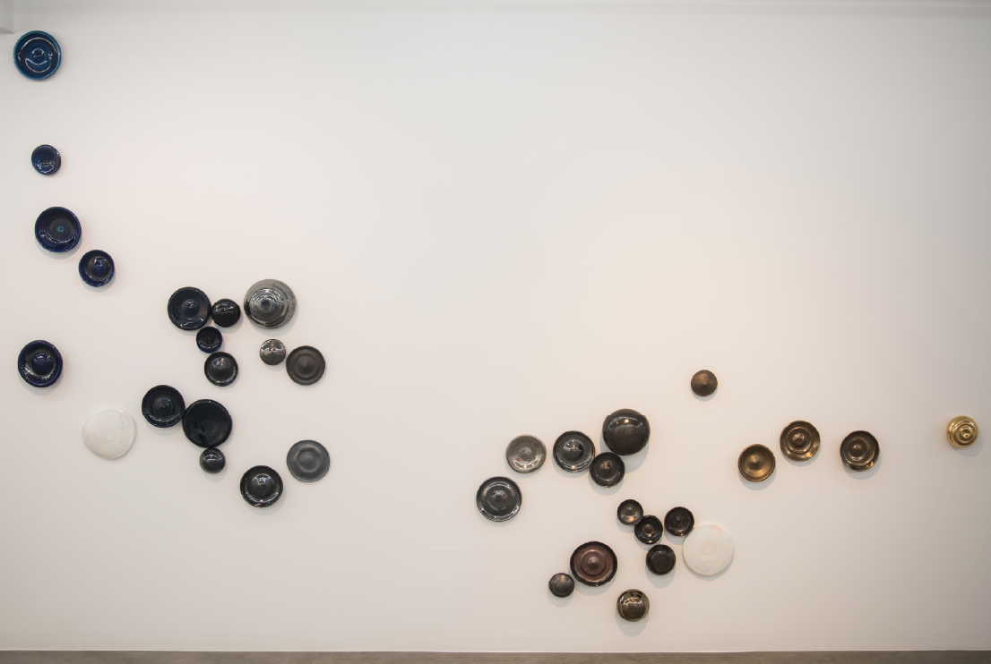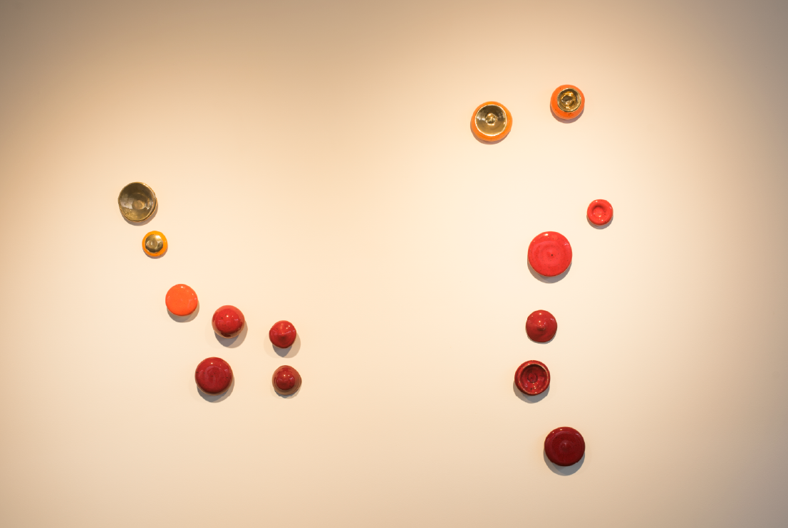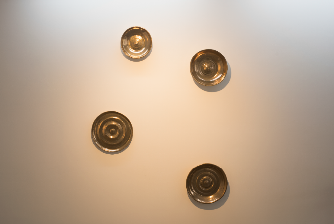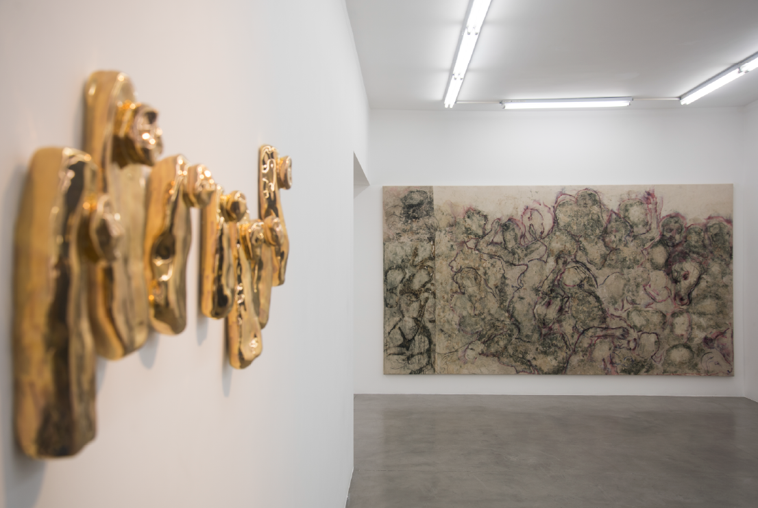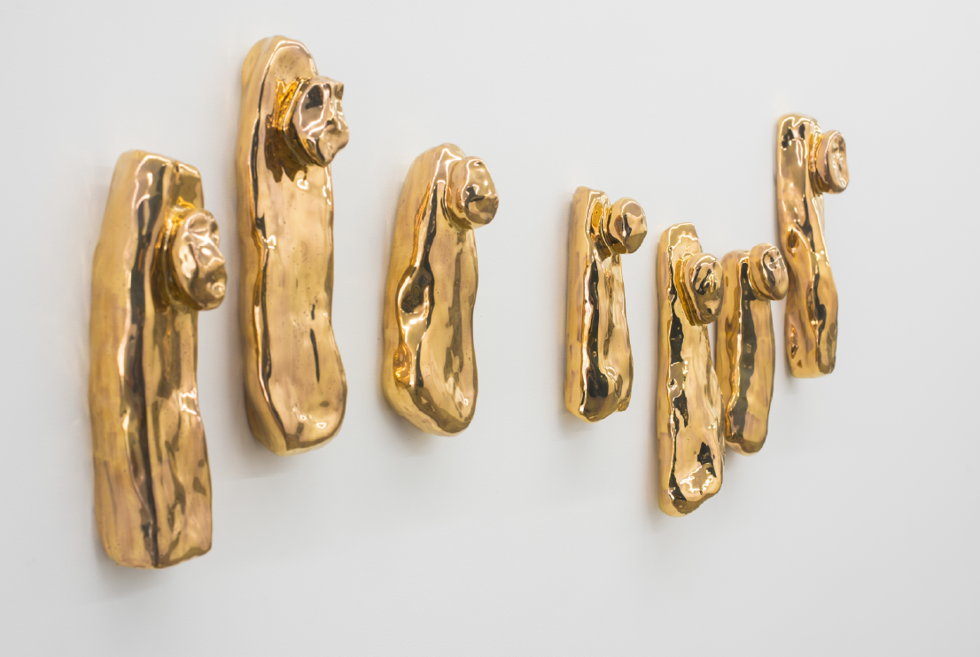 La condición humana, 2018. Cerámica esmaltada con lustre de oro. 60 x 130 x 7 cm.