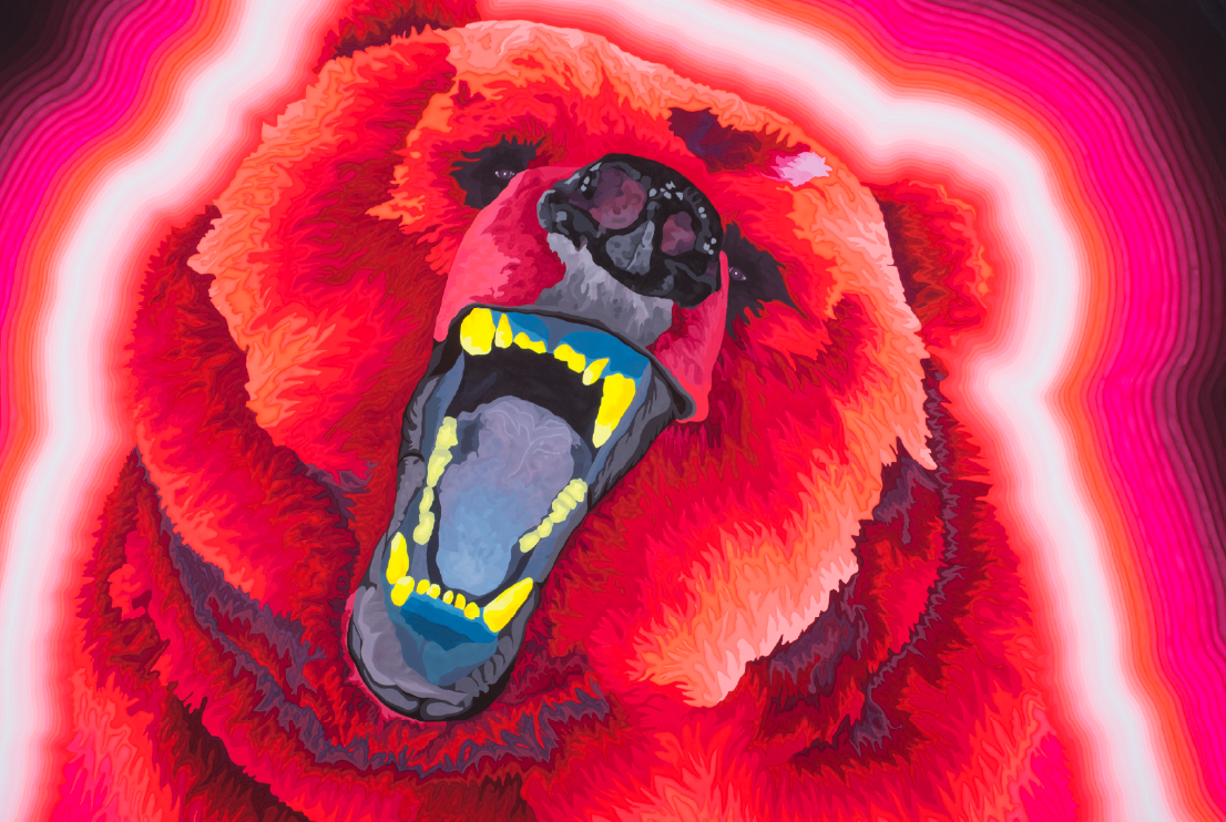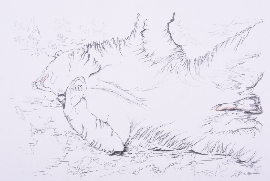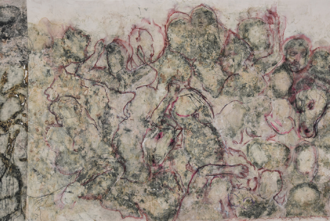Matar y morir, 2018-2019. Hongos, marcador, grafito y carbonilla sobre lienzo. 200 x 360 cm.