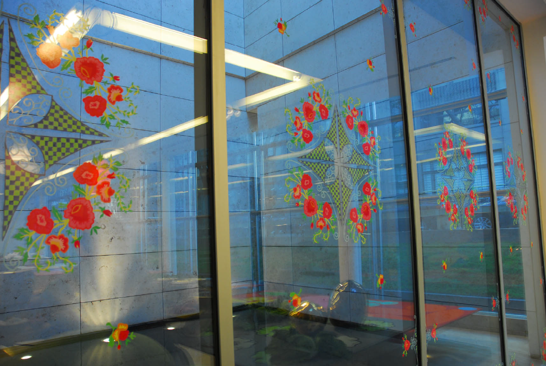 Motivo para mantel, 2008. Vinilo adhesivo sobre vidrio. Medidas variables.