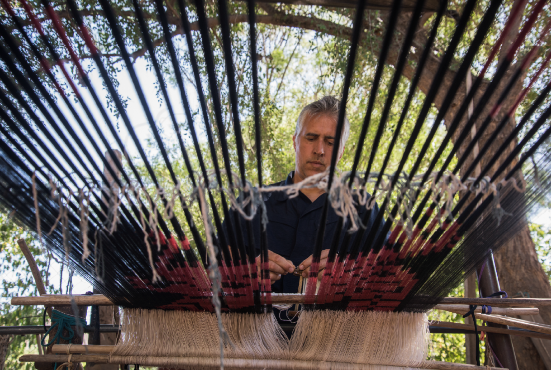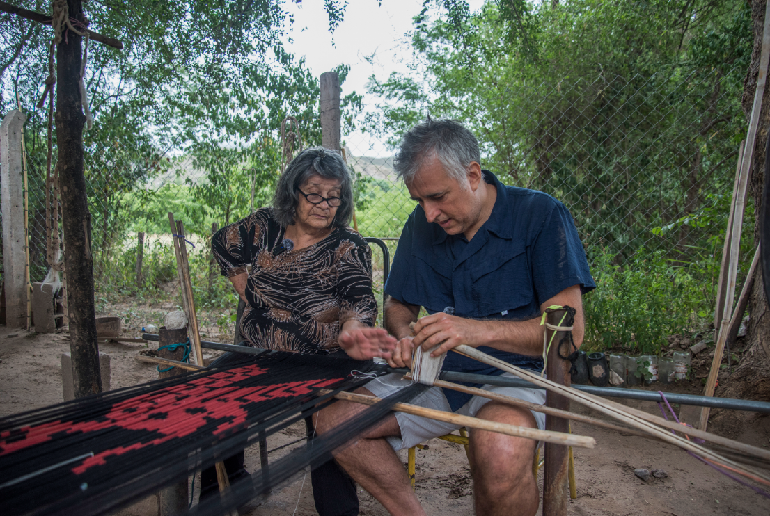 In a patio with a thousand shades of green and mountain view, a group of weavers turns threads into blankets, ponchos, and scarves. Selva Díaz, the matriarch, inspects the work of the others, most of them men. Her children and grandchildren join in the task, and La Negrita, Selva’s cousin, laughs at the antics of the young men who have come home late from a party somewhere. Everyone is seeing to the daily toil of weaving llama, sheep, alpaca, and vicuña wool. In Londres, Catamarca province, a learning process comes to an end, an education Gabriel Baggio had begun much earlier, when he was a boy who would wake up to delightful sounds and bodies gathered together. He once said that the archive of the knowing-making processes he has learned resides in the body. The people he works with are embodied archives of ways to cook, weave, carve wood, and build an adobe home—crafts by no means immediate, trades passed down from one generation to the next in a patient exercise of listening and exchange that can take weeks, months, years. When Baggio comes into contact with that archive, he generates the recovery and transmission of interlinked knowledges.