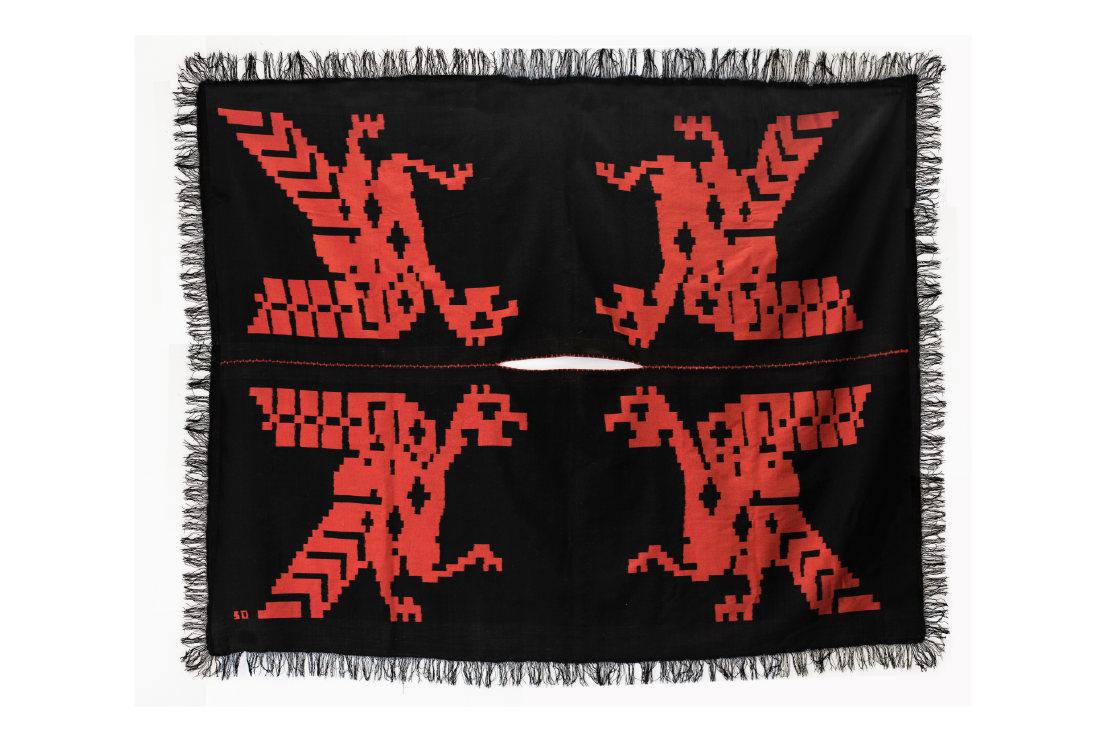 Poncho de guarda atada tejido en alpaca, 2025. Alpaca tejida. 120 x 260 cm.