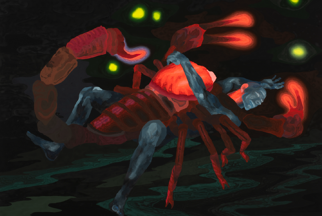It is not by chance, then, that he returns to the nineteen-seventies and eighties to reimagine the present. On the hallucinated image of the Mercedes Sosa concert he places an image that interrogates the space of the fantastic. Potencia emancipatoria [Emancipatory Power] is a terrain open to desiring experimentation, a sexual exploration not without animal violence that enables the artist to conceive of violence in a range of ways that span from the defensive to the offensive. In it, Baggio stages the cruel pull of the animal world, at once force of life and of destruction. The work is an open space insofar as it connects with the other paintings produced for the show, one for each of the songs Mercedes sang that night of her return. While their circular format is reminiscent of LPs, the images in these paintings with their scorpion tails in strident colored and animals are by no means illustrations of the song lyrics.. Indeed, the human-animal relationship is what holds the show’s poetic-ecological images together, as is evident in works like Alfonsina y el mar [Alfonsina and the Sea], Los mareados [The Lushes], Sólo le pido a Dios [I Only Ask of God], Duerme negrito [Sleep, Negrito], and Sueño con serpientes [I Dream of Snakes].