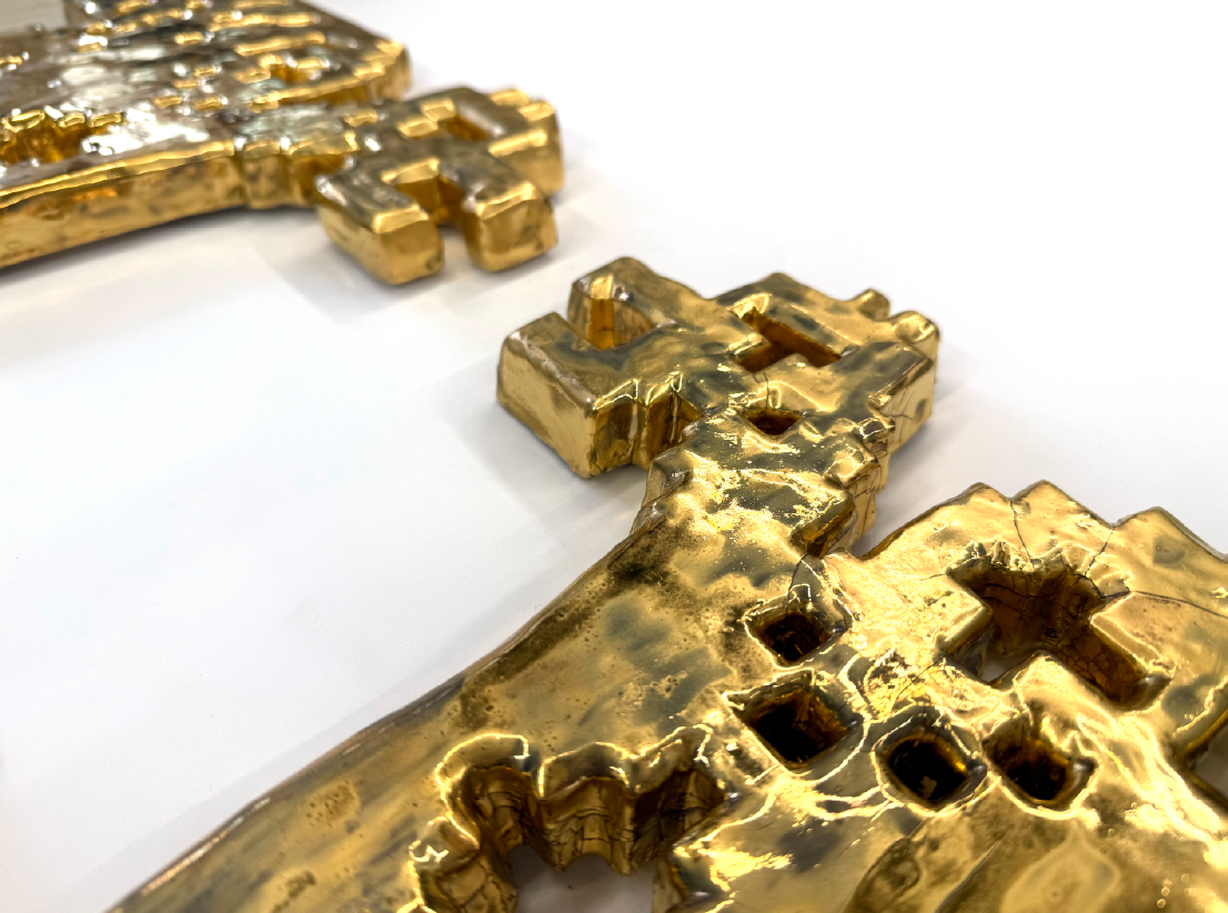 Las herramientas de Selva, 2025. Cerámica esmaltada con lustre de oro. 190 x 130 cm.