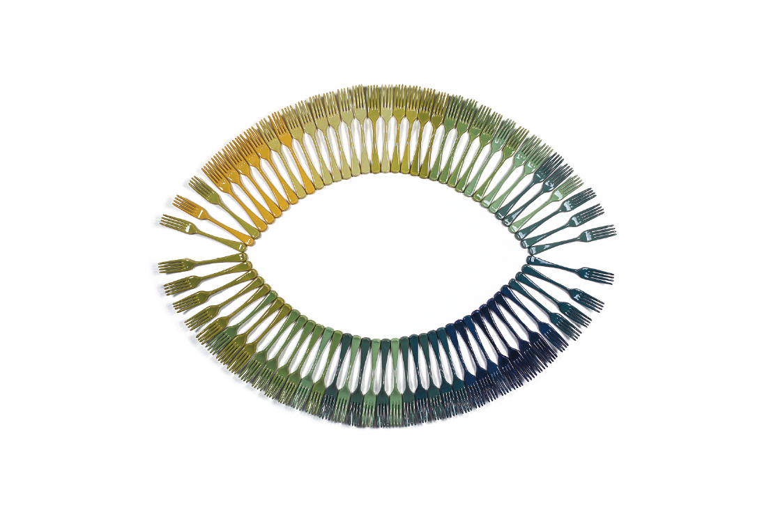 La toma de posición (oposición) artesanal, que asume el artista se manifiesta en su obra fetiche Conversación que parece burlarse de las pretensiones de completitud. Como una Penélope diurna, huidiza de las noches, Gabriel teje y teje mientras interactúa con quien se siente a su lado. Elige ubicarse bajo el Ojo antropofágico. Una mirada de párpados dentados que da una vuelta de tuerca más y devora hasta el propio manifiesto de Oswald de Andrade. Su bella presencia hostiga a la obra de Kay. Como una planta carnívora acecha. Los tenedores calcados de uno traído desde Italia por su abuela, se vuelven frágiles en su materialidad pero amenazantes en su presencia. Vacíos, sin la carga de alimento, (símbolos del hambre) esperan poder deglutir imágenes, al tiempo que indagan sobre la (in)capacidad de nutrición del arte.