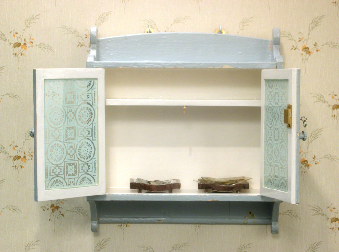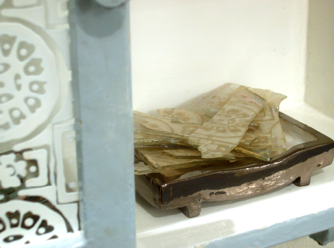Mueble (detalle), 2004. Madera, vidrio y cerámica. 50 x 70 cm.