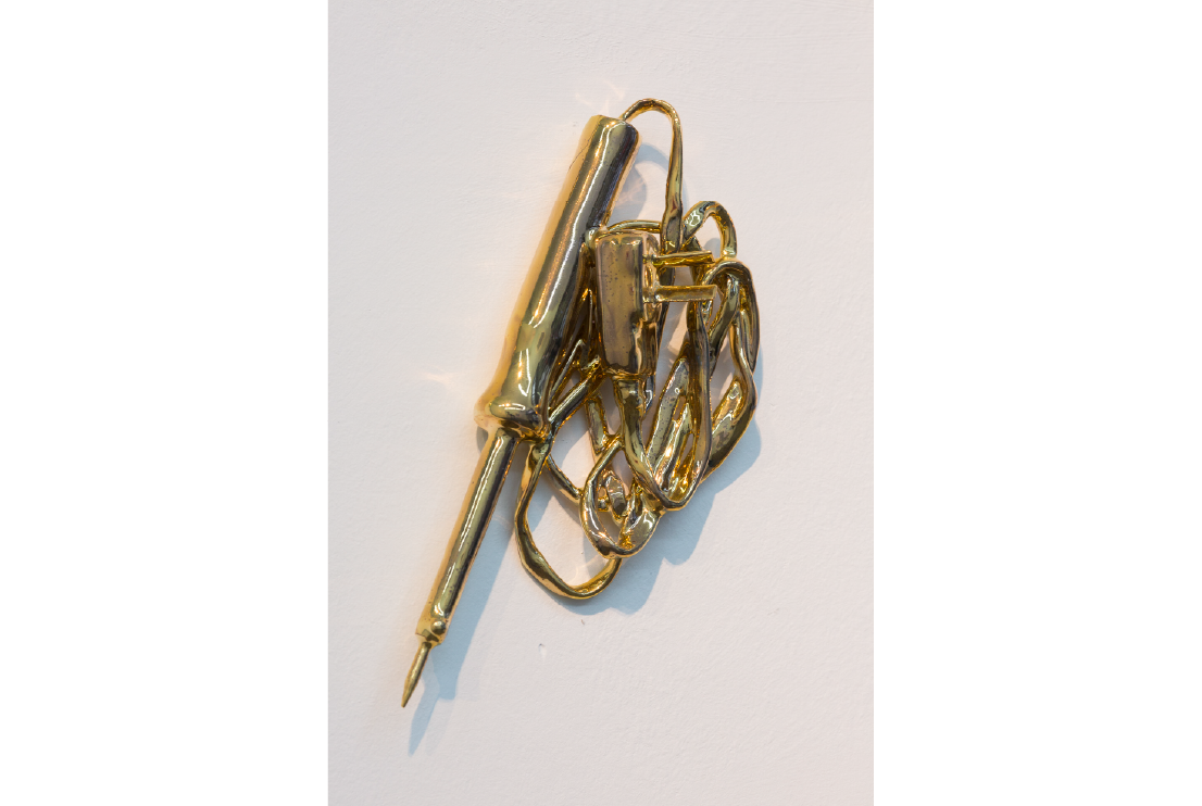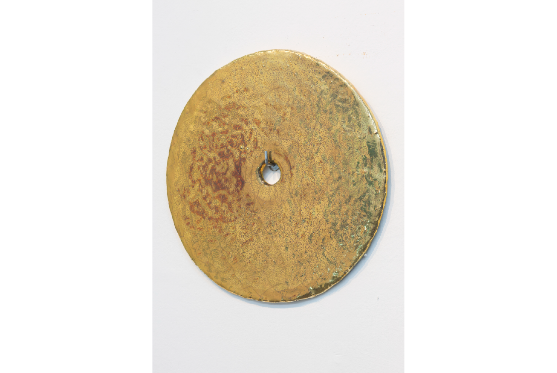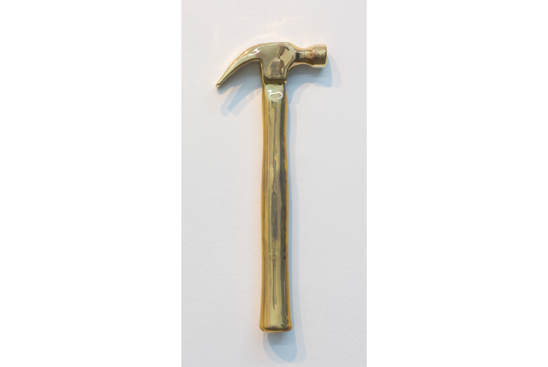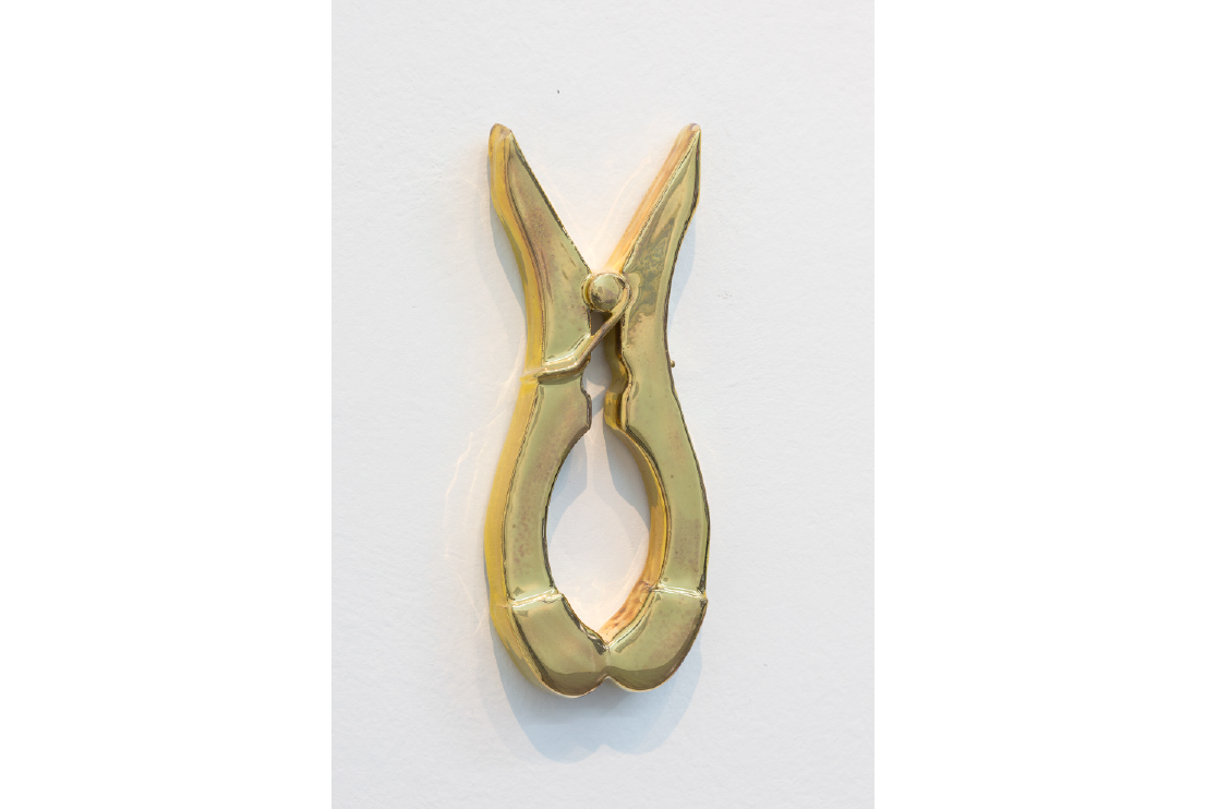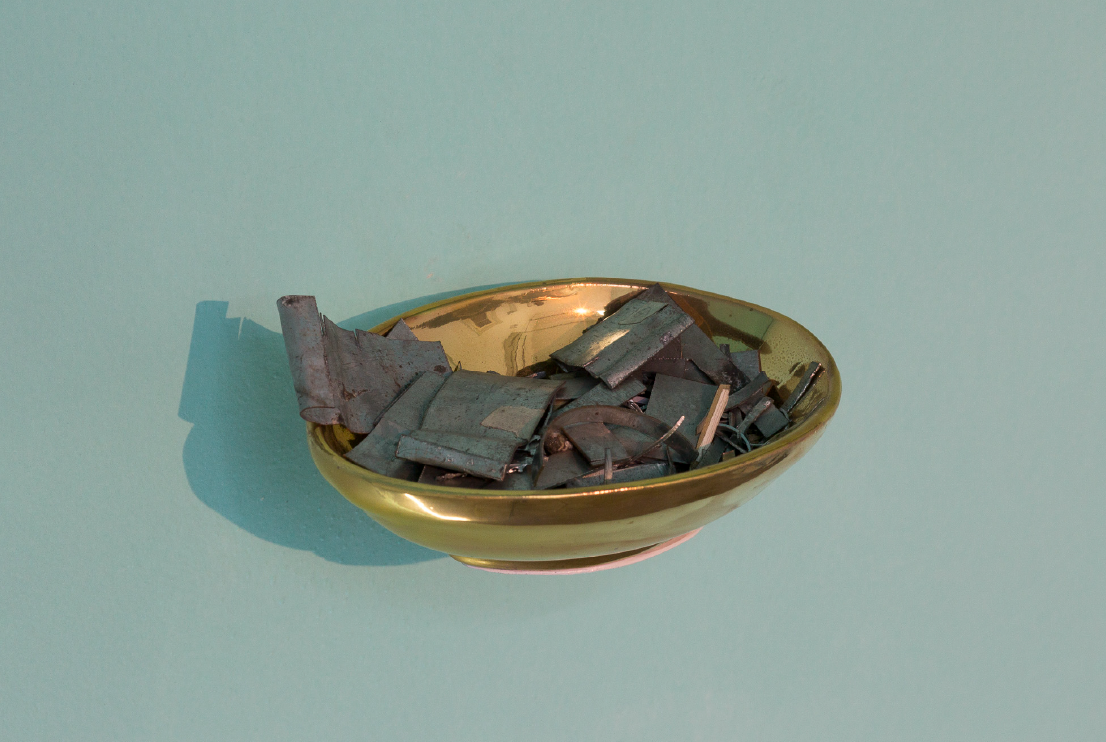 Fabers, 2018. Cerámica esmaltada, lustre de oro, restos de zinc y estaño. 5 x 15 cm.