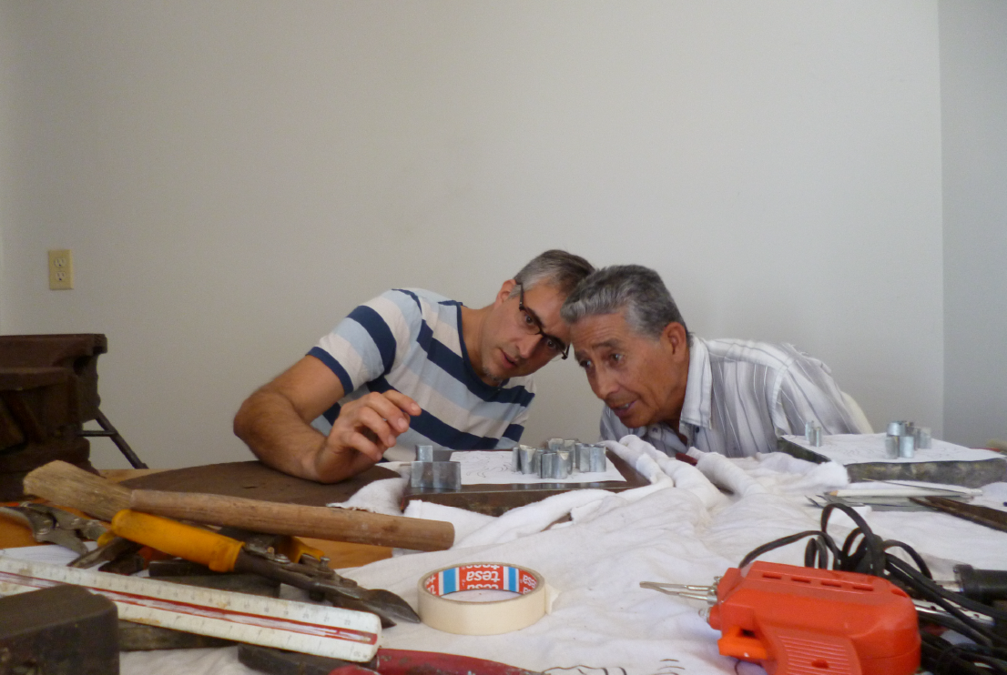 El trabajo. Descartar formas de producción manual y, con ellas, modos de existencia es moneda corriente en la era aciaga del capital. Cuando muchos (puestos de) trabajos se encuentran en vías de extinción, Gabriel Baggio se empeña en retener los saberes y destrezas involucrados en técnicas consideradas obsoletas. Modos de hacer, oficios de construcción que rescata en una tenaz pedagogía cuerpo a cuerpo. Cuando parte del arte contemporáneo se aletarga en sobreactuaciones dóciles del ready-made, Baggio emprende la factura de todo, cual condición de supervivencia humana: “Atravesar la experiencia de hacerse las cosas como posibilidad de pensarse de otra manera”, nos sugiere. En su exposición individual Fabers, la sala de la galería parece un cálido espacio de disección. El proceso de producción de un metro cuadrado de piso calcáreo se despliega completamente de fin a principio. Obra, descartes, accidentes, matrices, pruebas, bocetos, herramientas. Todo lo exhibe en una disposición donde el paso a paso rebota de pieza en pieza hasta llegar al registro primero del aprender a hacer con las propias manos. En un cuarto oscuro se proyectan las lecciones y los tropiezos de las jornadas de trabajo que Gabriel transitó junto a virtuosos hacedores de pisos de cemento líquido en la ciudad de Guatemala (en el marco de la residencia URRA/YAXS durante julio y agosto de 2017). Atento a experimentar con métodos ajenos, se esfuerza por dibujar contornos con soldaduras; se aventura a pintar encauzando fluidos de colores; se anima al manejo algo torpe de la gran prensa a tornillo.