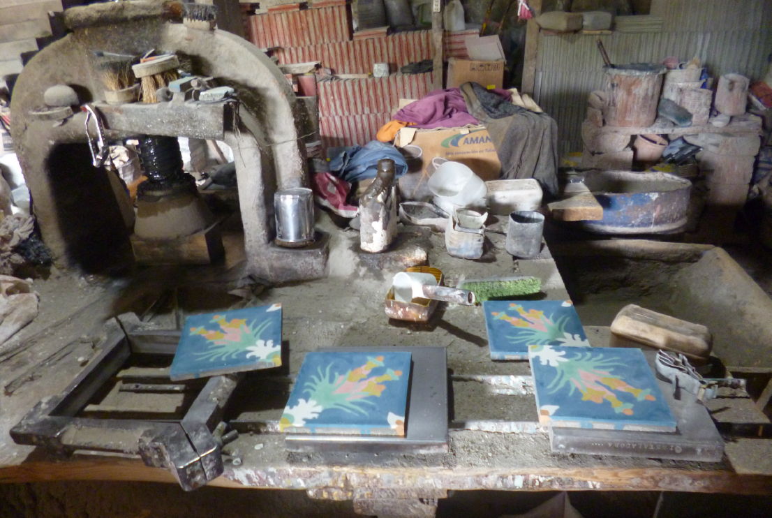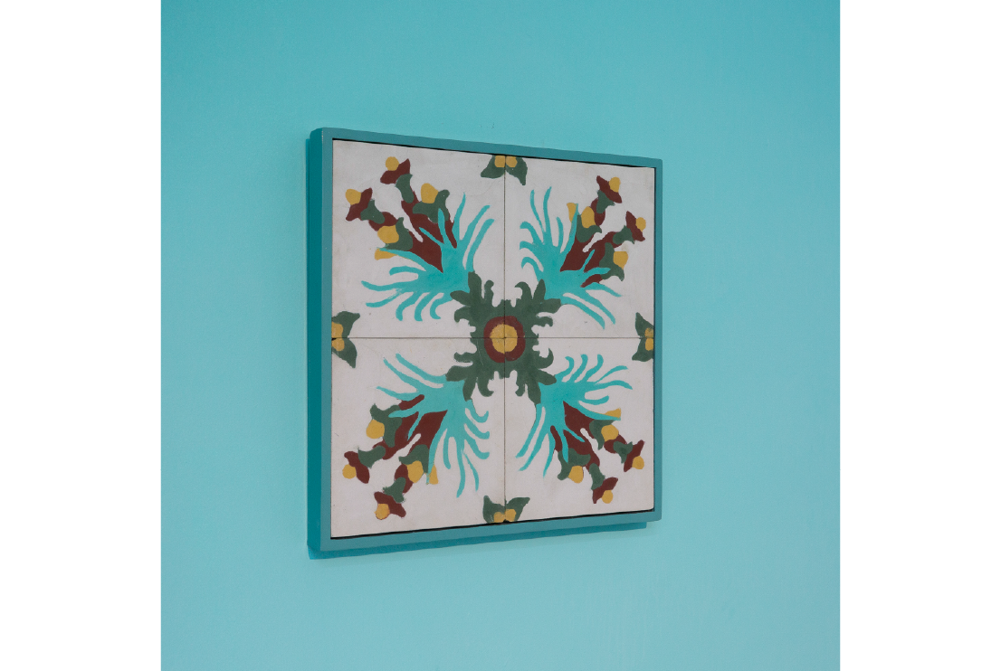 Prueba de color, 2018. 4 baldosa calcáreas y madera. 43 x 43 cm.
