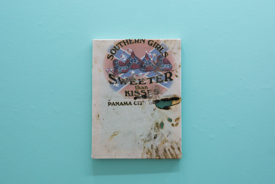 Worked Pop, 2018. Quemaduras, restos de soldadura y estaño sobre tela de remera. 46 x 34 cm.