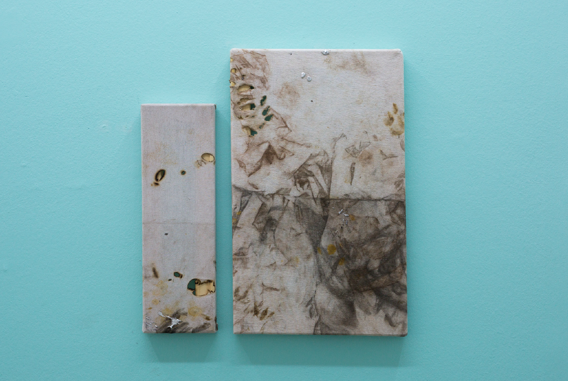 Worked Informalism, 2018. Quemaduras, restos de soldadura y estaño sobre tela de remera. 53 x 48 cm.