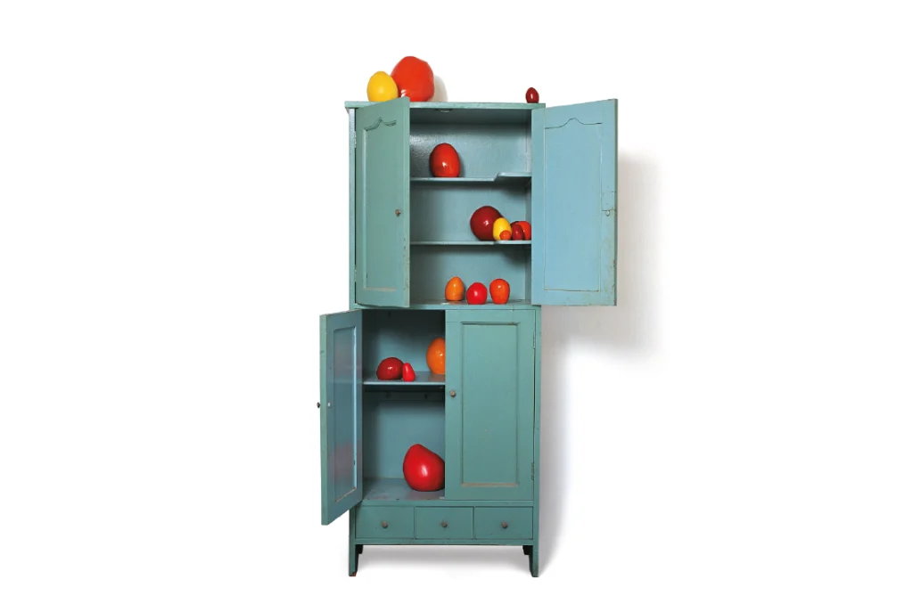 El Mueble traído de Irlanda, introduce la exposición que tuvo origen durante su beca de residencia en Europa –continente desde donde inmigraron sus abuelos a la Argentina-. Su exterior queda cargado con la estratigrafía de las capas pictóricas que, como arrugas en un rostro, muestran la impronta del paso del tiempo. Al igual que en otras obras donde rescata objetos fabricados por su propia familia, interviene este mobiliario anónimo para indagar su historia y conservarla. En la utilización de los botones de su abuela en Sueño americano. El camino del abuelo y el mueble de cocina hecho por su ancestro, Baggio toma lo dado para construir lo elegido. Estas obras comparten la idea de la inmigración como origen complejo de la identidad en constante configuración del artista. Puebla el mueble de su abuelo con formas ovoides, no sin llenar los cajones con los condimentos que moldearán su gusto. Es que precisamente a Gabriel le interesa degustar la historia para comprenderla.