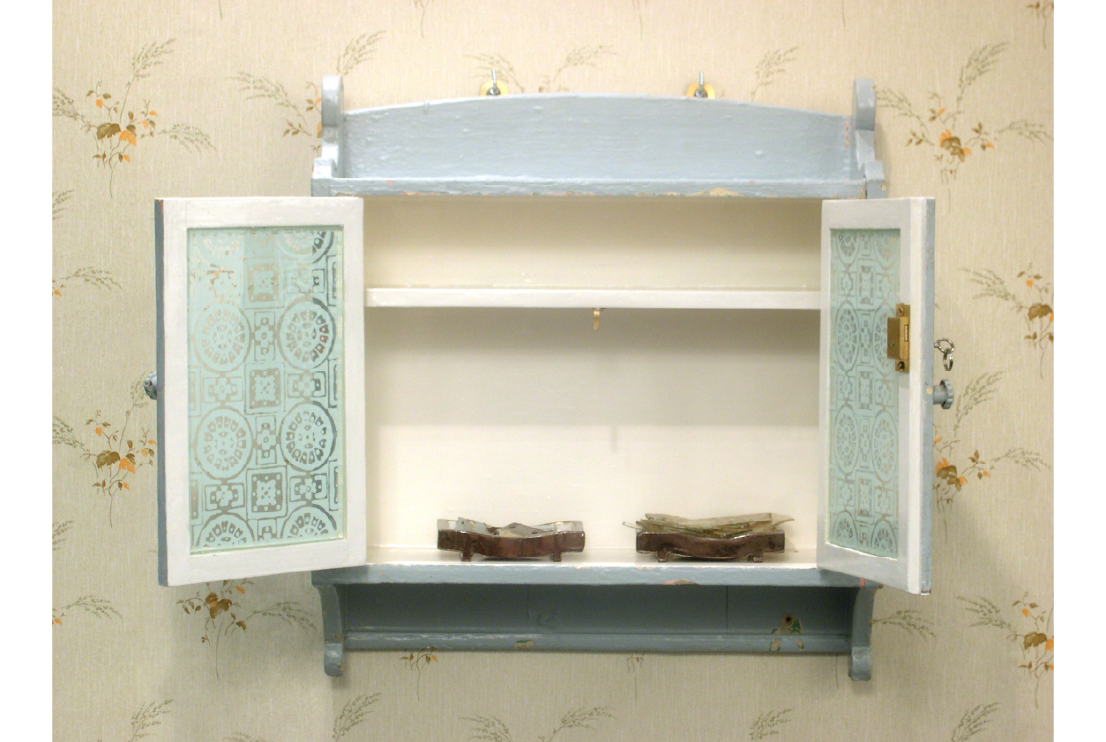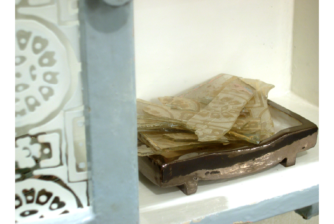 Mueble (detalle), 2004. Madera, vidrio y cerámica. 50 x 70 cm.