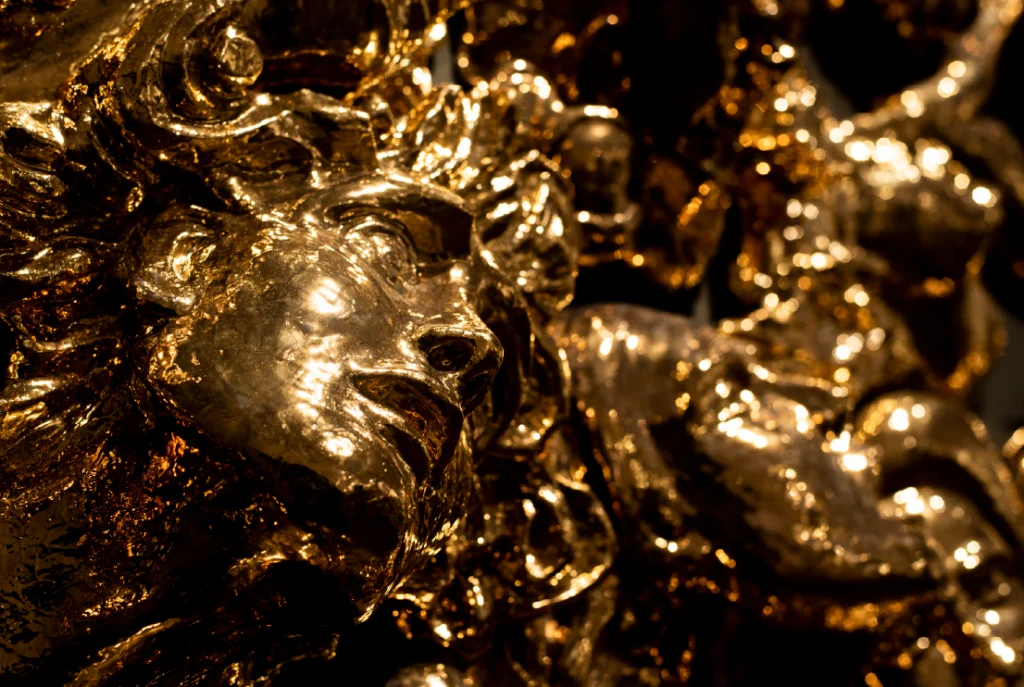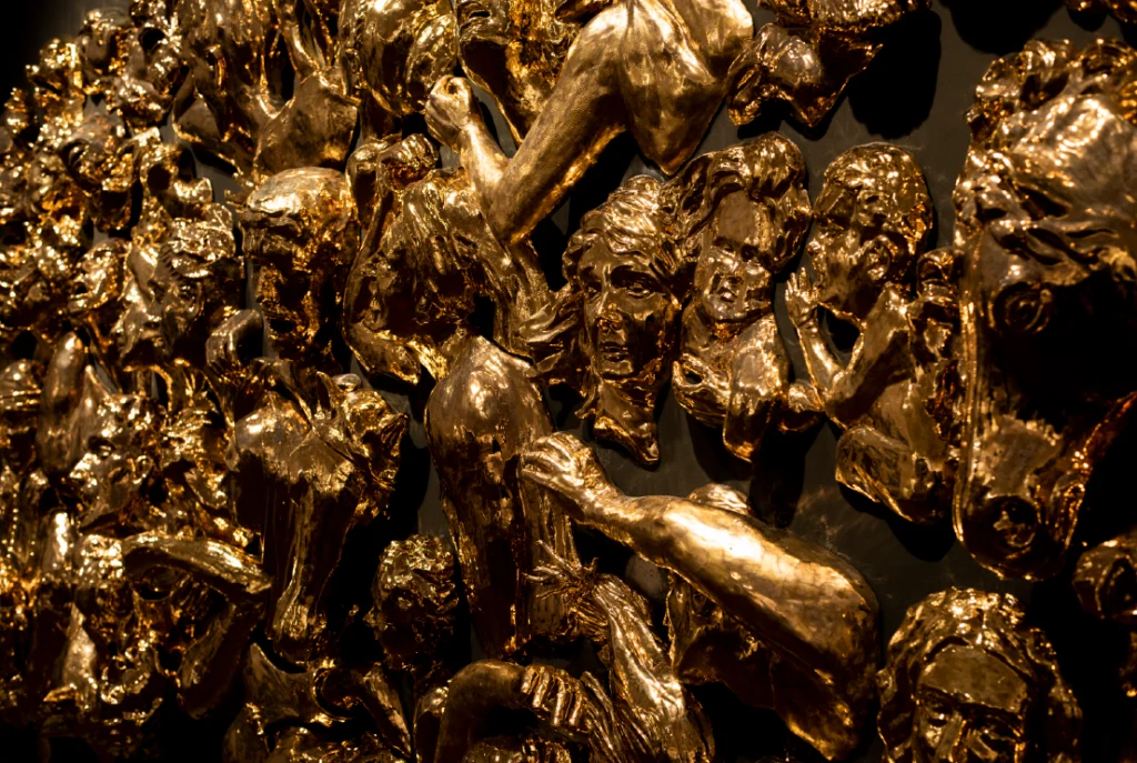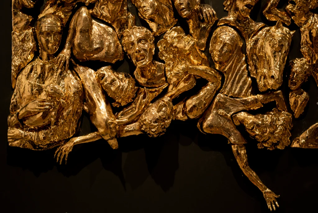 Matar y morir, 2020. Cerámica esmaltada con lustre de oro. 280 x 360 cm.