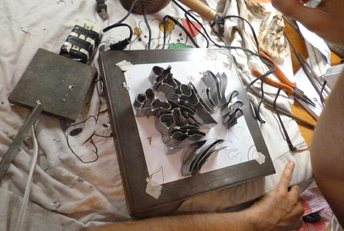 El trabajo. Descartar formas de producción manual y, con ellas, modos de existencia es moneda corriente en la era aciaga del capital. Cuando muchos (puestos de) trabajos se encuentran en vías de extinción, Gabriel Baggio se empeña en retener los saberes y destrezas involucrados en técnicas consideradas obsoletas. Modos de hacer, oficios de construcción que rescata en una tenaz pedagogía cuerpo a cuerpo. Cuando parte del arte contemporáneo se aletarga en sobreactuaciones dóciles del ready-made, Baggio emprende la factura de todo, cual condición de supervivencia humana: “Atravesar la experiencia de hacerse las cosas como posibilidad de pensarse de otra manera”, nos sugiere. En su exposición individual Fabers, la sala de la galería parece un cálido espacio de disección. El proceso de producción de un metro cuadrado de piso calcáreo se despliega completamente de fin a principio. Obra, descartes, accidentes, matrices, pruebas, bocetos, herramientas. Todo lo exhibe en una disposición donde el paso a paso rebota de pieza en pieza hasta llegar al registro primero del aprender a hacer con las propias manos. En un cuarto oscuro se proyectan las lecciones y los tropiezos de las jornadas de trabajo que Gabriel transitó junto a virtuosos hacedores de pisos de cemento líquido en la ciudad de Guatemala (en el marco de la residencia URRA/YAXS durante julio y agosto de 2017). Atento a experimentar con métodos ajenos, se esfuerza por dibujar contornos con soldaduras; se aventura a pintar encauzando fluidos de colores; se anima al manejo algo torpe de la gran prensa a tornillo.