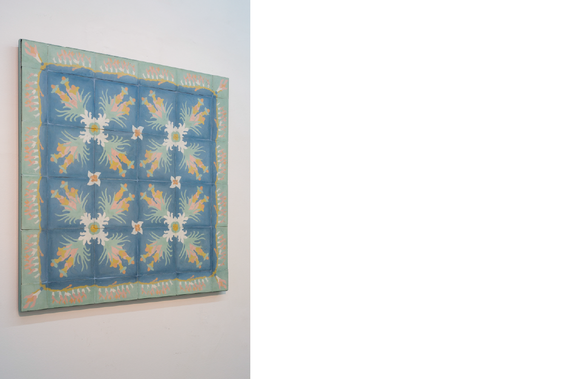 El suelo. Esta técnica de fabricación que no necesita cocción se originó en Francia en el siglo XIX y con la eficacia de los imperios, su producto pavimentó las tierras americanas de norte a sur; desde sus estancias, sus templos y sus edificios públicos hasta sus casas, con sus patios. ¿Qué pisamos desde entonces? ¿Cómo nos paramos sobre esos civilizados y rígidos suelos cultivados con flores extranjeras y sus inertes implicancias? Como una sutil interferencia botánica, el artista planea y ejecuta un trasplante. Corrompe los modelos de belleza naturalizados, interfiere en la iconografía vegetal foránea con una nueva siembra de flores nativas de la pampa: salvia guaranítica, flor de la tarde, clavel del aire. Flores salvajes que Baggio excepcionaliza pictóricamente con cemento y pigmentos en el terreno de la cultura del pavimento.
