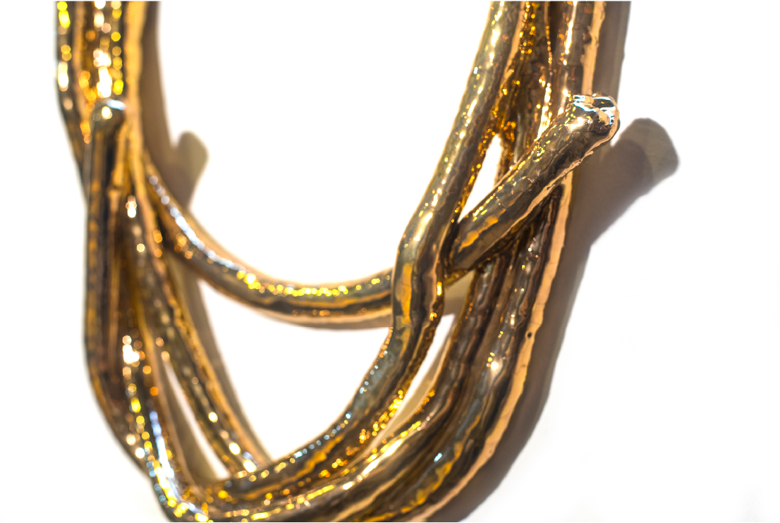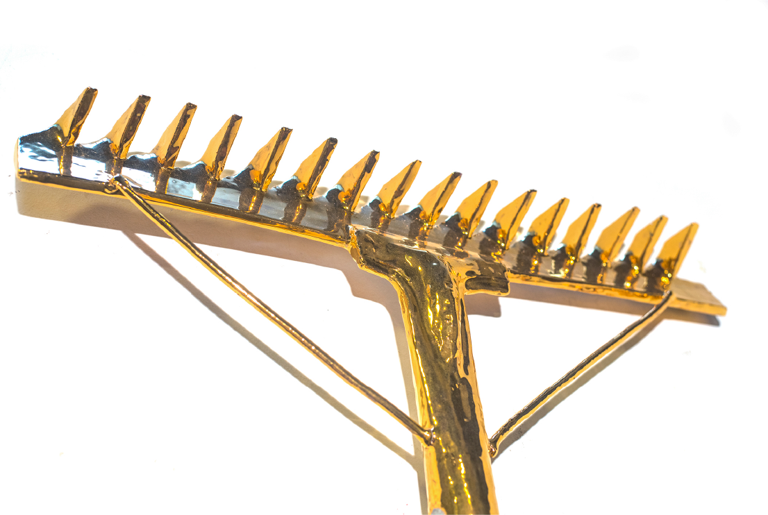 Mientras las artes decorativas han estado dominadas por motivos de la naturaleza, alegorías en cuerpos de estilizadas figuras femeninas, relatos mitológicos y escenas galantes, la obra de Baggio toma un conjunto de herramientas como elemento ornamental. Son una réplica, a escala real, de aquellas que empleó para la construcción de una casa de adobe en la llanura pampeana, performance en la que aprendió esta ardua tarea. Invierte así los valores de la ornamentación tradicional al centrar su atención en el trabajo manual por sobre iconografías asociadas al ocio y a la cultura erudita de las clases pudientes. Su ubicación en la antecámara del palacio irrumpe dentro del relato que portan los objetos legados por la familia Errázuriz Alvear, sus antiguos propietarios, y a cuyos retratos se contrapone. Si el título afirma un cambio de perspectiva sobre el campo, su emplazamiento en la exhibición opera como memoria de la desigualdad que hizo posible la exuberancia de esta arquitectura. Interroga críticamente al patrimonio público a partir de la seducción plebeya de sus formas.