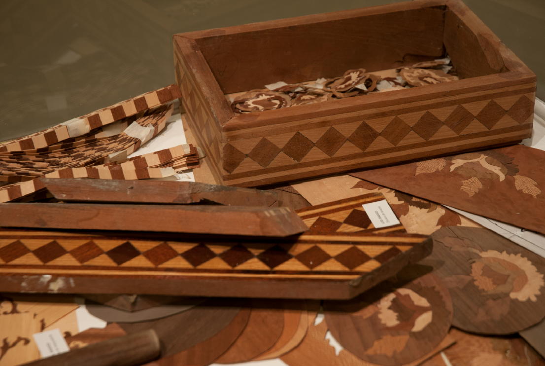 Las herramientas de Julio, 2014. Cerámica esmaltada con lustre de platino. 110 x 140 cm.