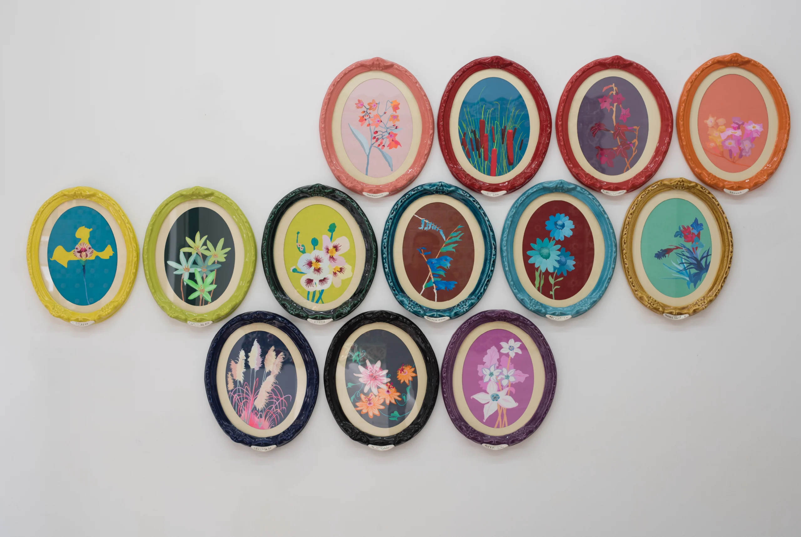 Abrirse paso en la soledad (vista de serie completa), 2015. Gouache sobre papel y cerámica esmaltada. 300 x 180 cm.