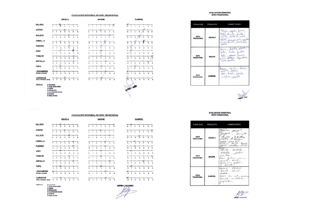 Dos saboristas profesionales hicieron el análisis técnico de las sopas y determinaron que: El perfil de sabor de la sopa I (abuela) fue LA MÁS DULCE, debido a la mayor presencia de choclo y batata. El perfil de sabor de la sopa II (madre) fue LA MÁS CONTUNDENTE Y COMPLETA, CON MÁS CUERPO, debido a la mayor presencia de carbohidratos como papa, zapallo, batata y legumbres. El perfil de sabor de la sopa III (hijo) fue LA MAS ÁCIDA Y MENOS DENSA, debido a la menor cantidad de ingredientes y a la mayor presencia de tomate y hojas verdes.