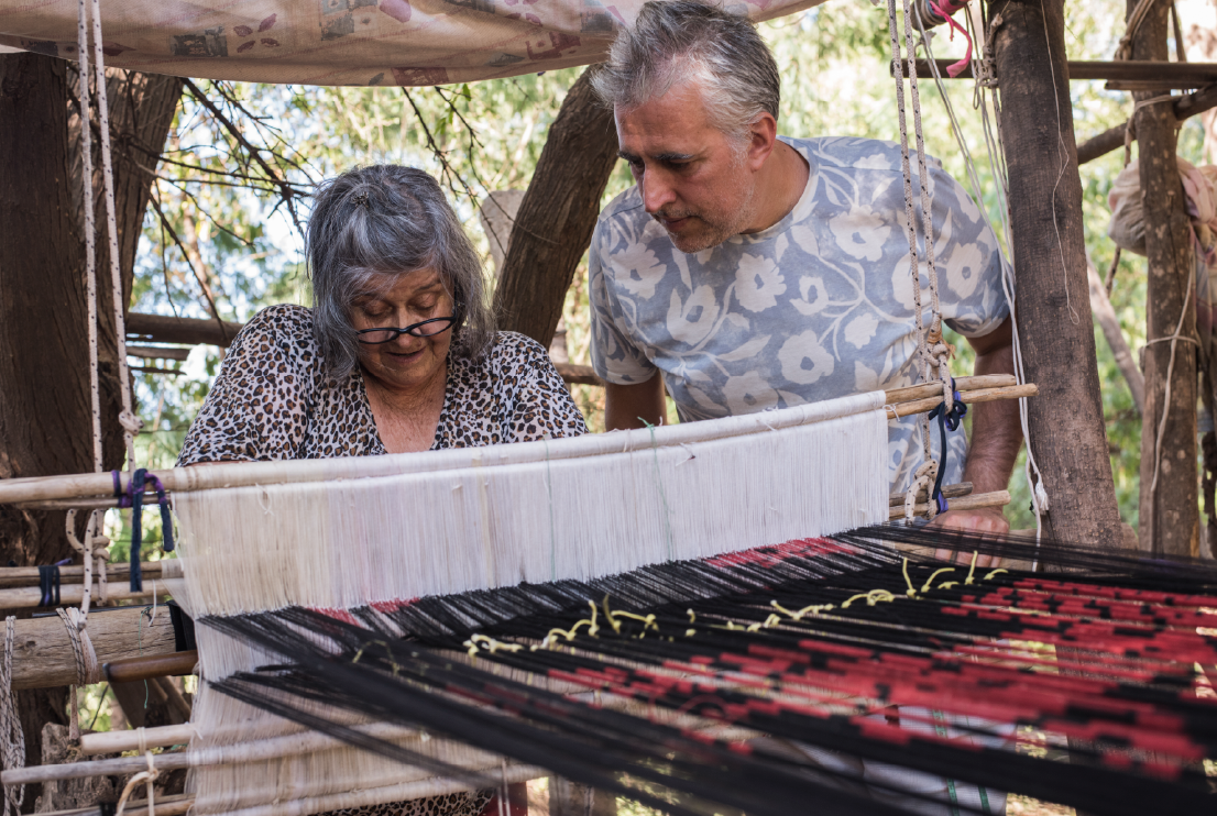 La relación con la animalidad también estará presente en el poncho de las águilas, como se conoce popularmente al poncho que Mercedes vistió en varias presentaciones, incluida la noche de su regreso. El ikat, la técnica con que está realizado, se utiliza en comunidades de Argentina, México, Bolivia, Chile, Guatemala, Colombia, Ecuador y Perú, así como en ciertas regiones de Asia Central y del sudeste asiático. La técnica favorece el diseño antropomorfo y zoomorfo en espejo, dando por resultado figuras duales. Las cuatro águilas rojas que están representadas en el poncho le dan nombre al más representativo de los utilizados por Mercedes Sosa. Para la investigadora Roxana Amarilla, los motivos ornitomorfos están “asociados a hitos de su trayectoria, como lo fueron el exilio, el retorno al país y los conciertos masivos”. El poncho de las águilas en particular, continúa Amarilla, “se integró a un relato épico que conjugó la resistencia a la dictadura con los sueños de la primavera democrática”. Sosa utilizó al menos siete ponchos producidos en Londres, Catamarca, todos con motivos zoomorfos y coloraciones diferentes. Baggio decidió seguir su itinerario para realizar junto a Selva Díaz, una de las tejedoras más reconocidas de Londres, uno idéntico al utilizado por Mercedes aquella noche, reincidiendo en el trabajo alrededor de la copia. Son varias semanas de trabajo bajo los nogales del patio familiar, en las que aprenderá las distintas acciones de un proceso prolongado y laborioso: dibujará el águila con la técnica de la guarda atada, teñirá la lana de alpaca, realizará la urdimbre y el enlizado, en los que tejerá la pieza en el telar de Selva. Lo hace mientras establece una relación de amistad con la tejedora y su familia. Serán días en los que se intercambien comidas y recetas que lo integran a la comunidad.
