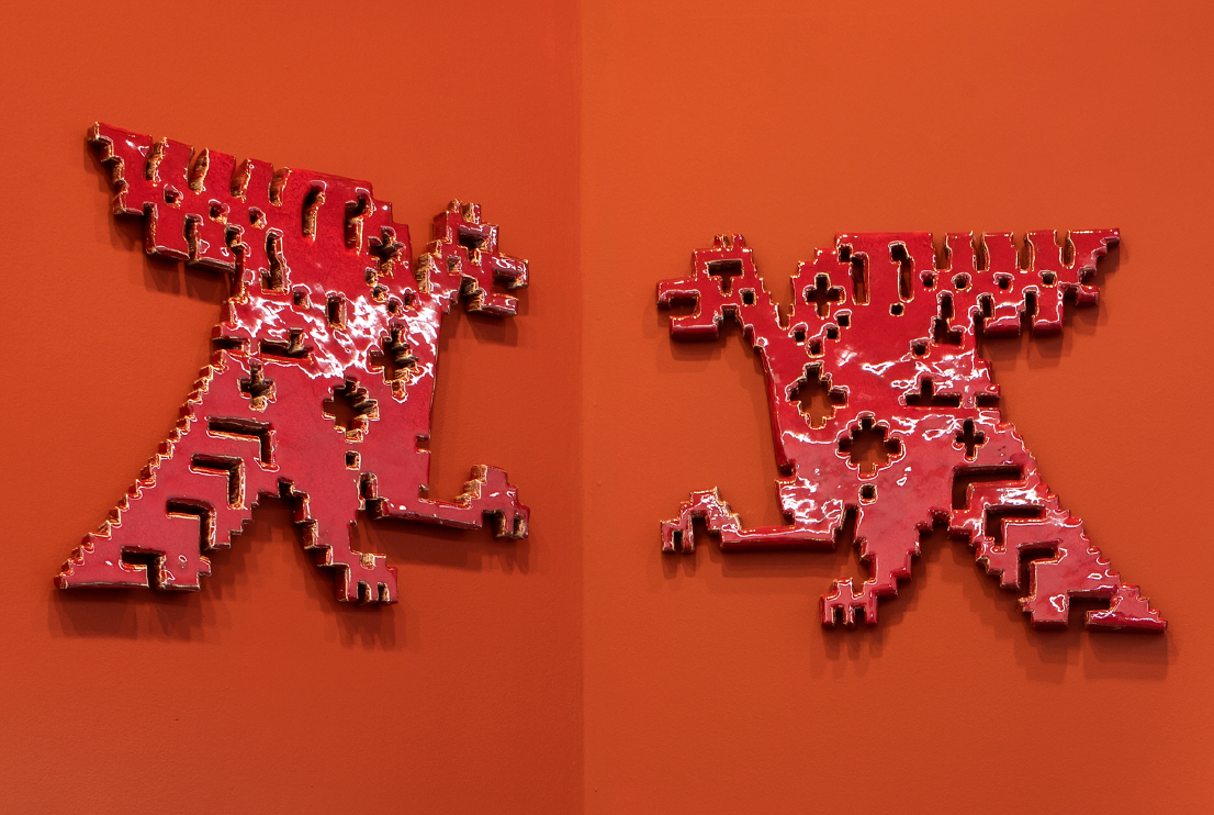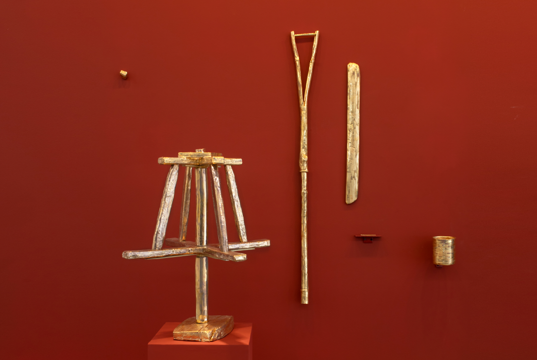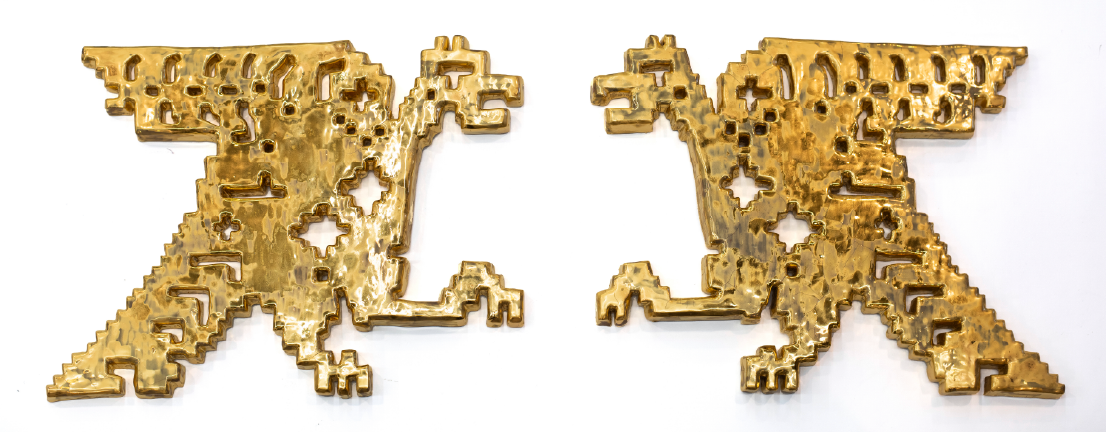 Las herramientas de Selva, 2025. Cerámica esmaltada con lustre de oro. 190 x 130 cm.