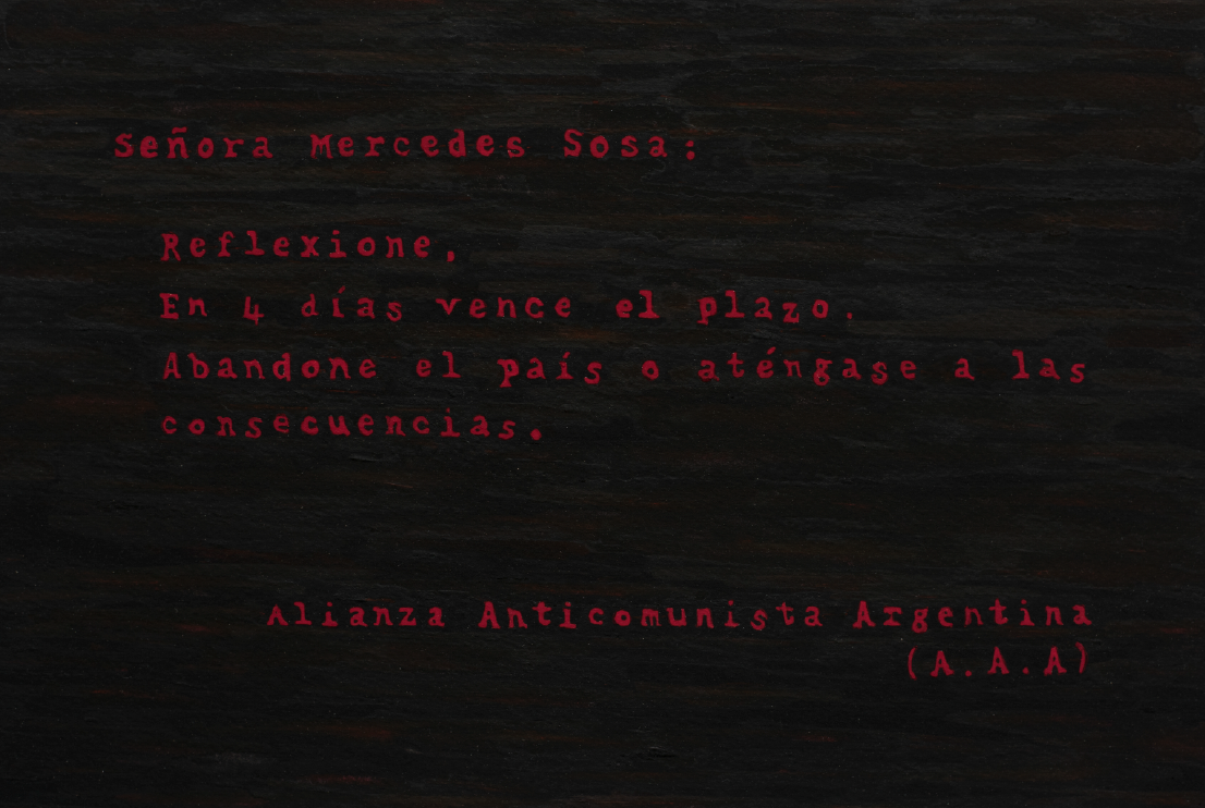 Mercedes permaneció incomunicada y detenida por más de dieciocho horas, sufriendo el maltrato de las fuerzas represivas, pese a que los edictos policiales y las crónicas periodísticas de la época afirmaban lo contrario. Pocos días después debía tocar en el Teatro Lasalle de la Ciudad de Buenos Aires, en donde interpretaría un repertorio similar, pero una amenaza de bomba recibida pocas horas antes impidió la realización del concierto. “Me voy porque no tengo trabajo”, dicen que dijo al momento del exilio, aunque existía una circular que informaba que debía ser detenida si cantaba. La cultura era un blanco de ataque por el dispositivo represivo, por eso no sorprende que quien firma la detención de la artista sea Jaime L. Smart, quien apenas dos años antes había arengado ante Ramón Camps y Miguel Etchecolatz: “La subversión, señores, es ideológica. Sus infiltrados están agazapados en el ámbito de la cultura”.